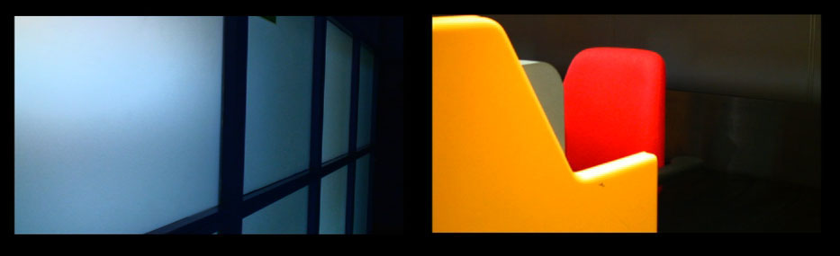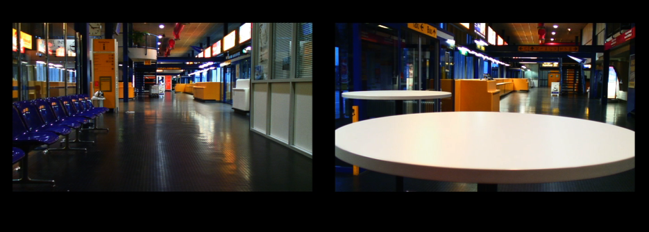 In Anticipation (video installation) A split screen video installation of a small, seemingly abandoned airport, the brightly coloured interior design reminiscent of the 80's. All lights and displays are still on. It seems as if the whole airport is in silent anticipation of any kind of action. Because of its yellow, red and blue colours the contrast between action and anticipation is even more tangible. The airport was filmed the way it was found, in the middle of the day, with no-one around. The final result is shown on a transparent screen, hanging in the middle of a dark space, that displays the video on both sides. The images are accompanied by an abstract foretelling sound.